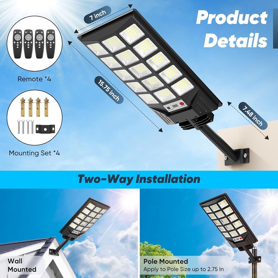 Iluminacin solar va exterior para estacionamiento, garaje, camino, valla, vas, pasarela, patio, jardn, rea comercial, campo deportivo, entrada, almacn, puerta principal, iluminacin de seguridad al aire libre, iluminacin de respaldo para cortes de energa caminos.